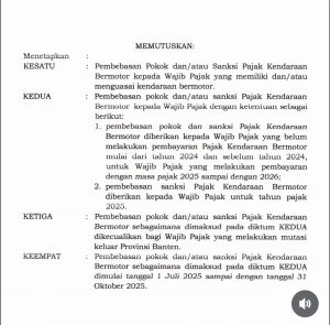 Sebelumnya, keputusan ini telah diatur secara resmi dalam Keputusan Gubernur Banten Nomor 286 Tahun 2025 yang ditetapkan pada 25 Juni 2025 di Serang. Dalam keputusan itu juga ditegaskan bahwa program ini berlaku mulai 1 Juli 2025 hingga 31 Oktober 2025, dan tidak berlaku untuk kendaraan yang akan dimutasi keluar dari Provinsi Banten.