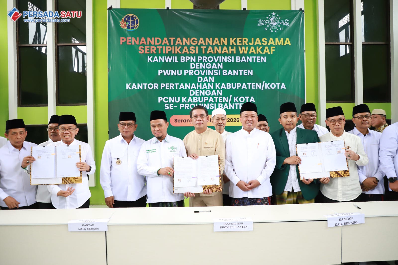 Bertempat di Aula MUI Provinsi Banten, Menteri Nusron menyerahkan 13 sertipikat tanah wakaf untuk rumah ibadah dan Lembaga pendidikan kegamaansekaligus menyaksikan penandatanganan kerja sama percepatan sertipikasi tanah wakaf antara Kanwil BPN Provinsi Banten dengan PWNU Provinsi Banten serta Kantor Pertanahan se-Provinsi Banten.