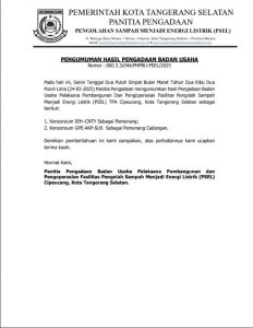 TANGSEL,PERSADASATU.COM-Pemerintah Kota (Pemkot) Tangerang Selatan (Tangsel) resmi menetapkan Konsorsium IEH-CNTY sebagai pemenang lelang proyek Pembangunan dan Pengoperasian Fasilitas Pengolah Sampah Menjadi Energi Listrik (PSEL) di Tempat Pembuangan Akhir (TPA)Cipeucang.