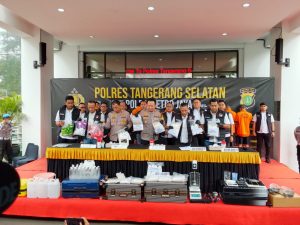 Tangerang Selatan,persadasatu.com – Satuan Reserse Narkoba (Satresnarkoba) Polres Tangerang Selatan bersama jajaran Polda Metro Jaya berhasil menggagalkan peredaran narkotika jenis sintetis lintas daerah. Dalam pengungkapan ini, sembilan tersangka diamankan dengan total barang bukti 21,2 kilogram narkoba senilai Rp21 miliar.