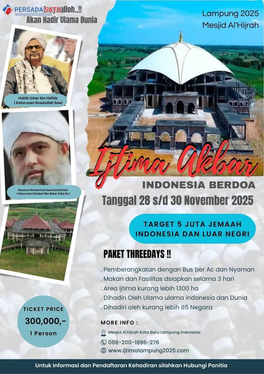 Lampung,persadasatu.com- 29 November 2025 Suasana religius menyelimuti Kota Baru Lampung, Sumatera Selatan, saat gelaran Tabligh Akbar Lima Benua resmi dimulai pada 28–30 November 2025. Kegiatan bertajuk Indonesia Berdoa ini menjadi magnet bagi umat Islam dari berbagai penjuru dunia. Tak kurang dari lima juta jamaah menghadiri agenda akbar tersebut, menjadikannya salah satu pertemuan umat terbesar di Asia Tenggara.